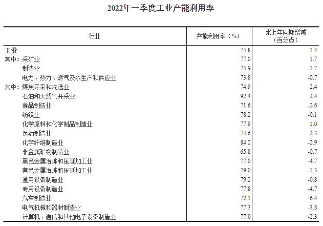 一季度,全國工業(yè)產(chǎn)能利用率為75.8%,比上年同期下降1.4個百分點,與2019年一季度基本持平。