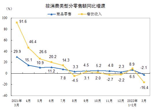 按消費(fèi)類型分,一季度商品零售98006億元,同比增長3.6%;餐飲收入10653億元,增長0.5%。3月份,商品零售31298億元,同比下降2.1%;餐飲收入2935億元,下降16.4%。