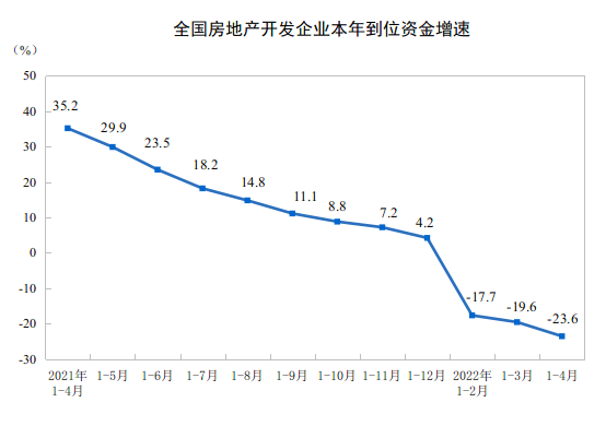 1—4月份,房地產(chǎn)開(kāi)發(fā)企業(yè)到位資金48522億元,同比下降23.6%。其中,國(guó)內(nèi)貸款6837億元,下降24.4%;利用外資38億元,增長(zhǎng)129.4%;自籌資金16271億元,下降5.2%;定金及預(yù)收款15357億元,下降37.0%;個(gè)人按揭貸款8037億元,下降25.1%。