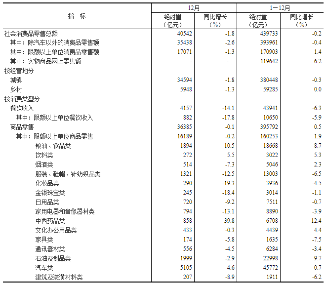 12月份,社會消費品零售總額40542億元,同比下降1.8%。其中,除汽車以外的消費品零售額35438億元,下降2.6%。