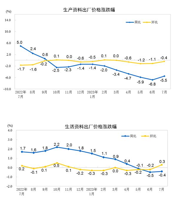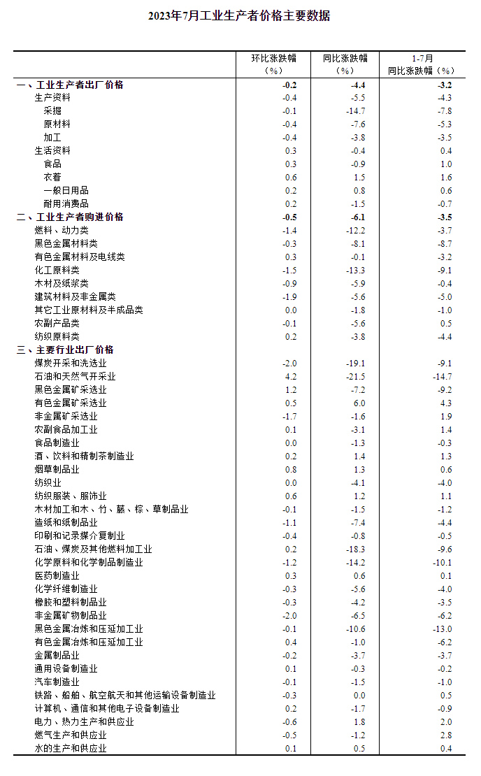 2023年7月份,全國(guó)工業(yè)生產(chǎn)者出廠價(jià)格同比下降4.4%,環(huán)比下降0.2%;工業(yè)生產(chǎn)者購(gòu)進(jìn)價(jià)格同比下降6.1%,環(huán)比下降0.5%。1—7月平均,工業(yè)生產(chǎn)者出廠價(jià)格比上年同期下降3.2%,工業(yè)生產(chǎn)者購(gòu)進(jìn)價(jià)格下降3.5%。