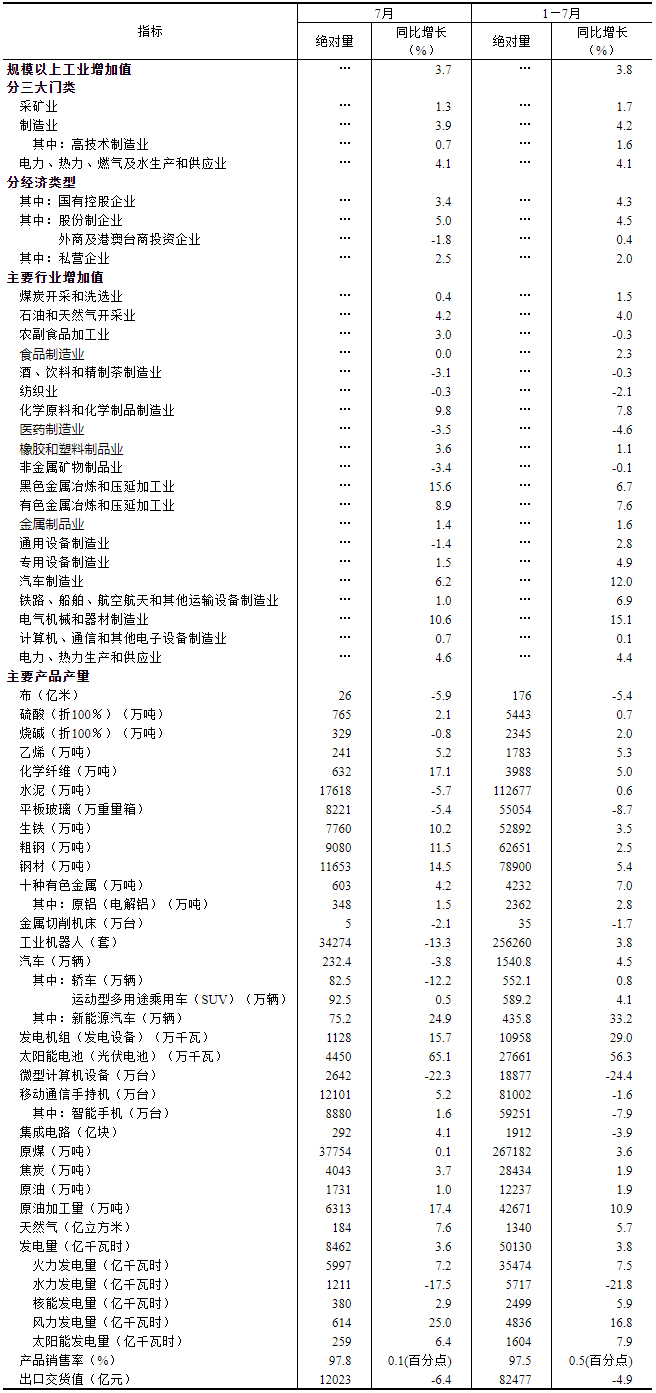 7月份,規(guī)模以上工業(yè)增加值同比實際增長3.7%(增加值增速均為扣除價格因素的實際增長率)。從環(huán)比看,7月份,規(guī)模以上工業(yè)增加值比上月增長0.01%。1—7月份,規(guī)模以上工業(yè)增加值同比增長3.8%。
