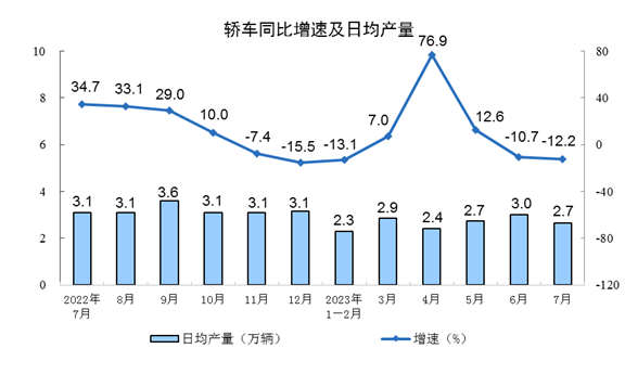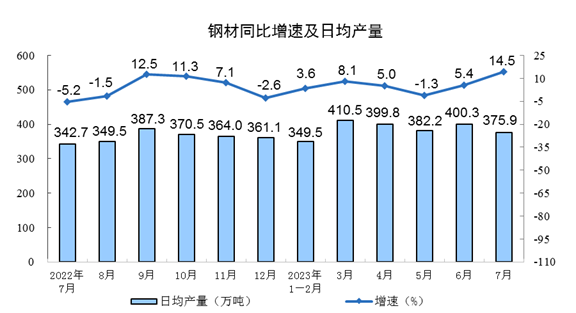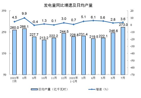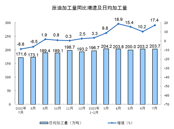 分產(chǎn)品看,7月份,620種產(chǎn)品中有303種產(chǎn)品產(chǎn)量同比增長。鋼材11653萬噸,同比增長14.5%;水泥17618萬噸,下降5.7%;十種有色金屬603萬噸,增長4.2%;乙烯241萬噸,增長5.2%;汽車232.4萬輛,下降3.8%,其中新能源汽車75.2萬輛,增長24.9%;發(fā)電量8462億千瓦時,增長3.6%;原油加工量6313萬噸,增長17.4%。