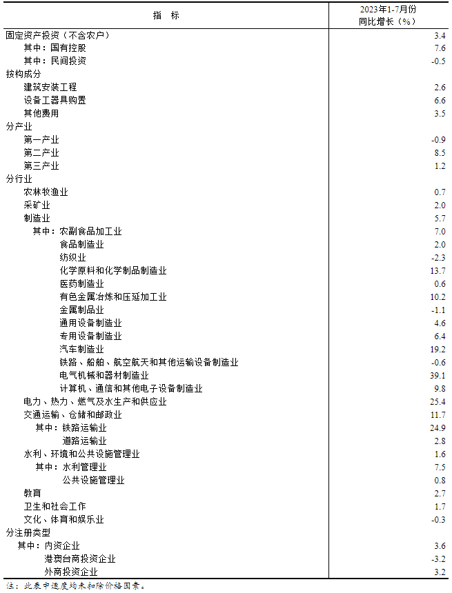 2023年1—7月份固定資產(chǎn)投資(不含農(nóng)戶)主要數(shù)據(jù)