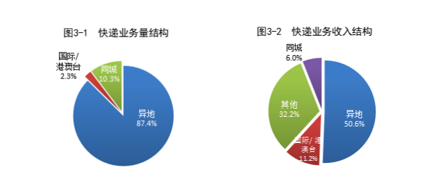 1—7月,同城、異地、國際/港澳臺快遞業(yè)務(wù)量分別占全部快遞業(yè)務(wù)量的10.3%、87.4%和2.3%;業(yè)務(wù)收入分別占全部快遞收入的6.0%、50.6%和11.2%。與去年同期相比,同城快遞業(yè)務(wù)量的比重下降1.7個百分點,異地快遞業(yè)務(wù)量的比重上升1.1個百分點,國際/港澳臺業(yè)務(wù)量的比重上升0.6個百分點。