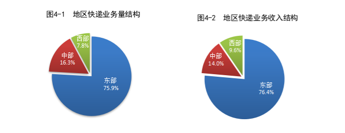 1—7月,東、中、西部地區(qū)快遞業(yè)務(wù)量比重分別為75.9%、16.3%和7.8%,業(yè)務(wù)收入比重分別為76.4%、14.0%和9.6%。與去年同期相比,東部地區(qū)快遞業(yè)務(wù)量比重下降1.2個百分點,快遞業(yè)務(wù)收入比重下降1.0個百分點;中部地區(qū)快遞業(yè)務(wù)量比重上升0.9個百分點,快遞業(yè)務(wù)收入比重上升0.7個百分點;西部地區(qū)快遞業(yè)務(wù)量和快遞業(yè)務(wù)收入比重均上升0.3個百分點。
