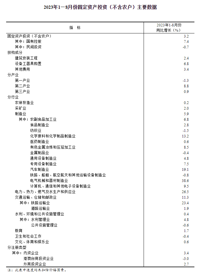 1—8月份,全國(guó)固定資產(chǎn)投資(不含農(nóng)戶)327042億元,同比增長(zhǎng)3.2%(按可比口徑計(jì)算,詳見附注7),其中,制造業(yè)投資增長(zhǎng)5.9%,增速比1—7月份加快0.2個(gè)百分點(diǎn)。從環(huán)比看,8月份固定資產(chǎn)投資(不含農(nóng)戶)增長(zhǎng)0.26%。1—8月份,民間固定資產(chǎn)投資169479億元,同比下降0.7%。