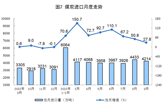 原煤生產(chǎn)保持穩(wěn)定,進(jìn)口快速增長。9月份,生產(chǎn)原煤3.9億噸,同比增長0.4%,增速比8月份放緩1.6個百分點(diǎn),日均產(chǎn)量1310萬噸。進(jìn)口煤炭4214萬噸,同比增長27.8%,增速比8月份回落23.0個百分點(diǎn)。