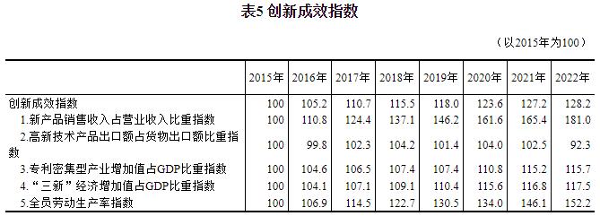 以2015年為100,2022年我國(guó)創(chuàng)新成效指數(shù)為128.2,年均增長(zhǎng)3.6%。分指標(biāo)看,新產(chǎn)品銷售收入占營(yíng)業(yè)收入比重指數(shù)增長(zhǎng)相對(duì)較快,年均增速為8.8%,2022年指數(shù)值為181.0;全員勞動(dòng)生產(chǎn)率指數(shù)、“三新”經(jīng)濟(jì)增加值占GDP比重指數(shù)、專利密集型產(chǎn)業(yè)增加值占GDP比重指數(shù)、高新技術(shù)產(chǎn)品出口額占貨物出口額比重指數(shù)的年均增速分別為6.2%、2.3%、2.1%和-1.1%,2022年指數(shù)值相應(yīng)為152.2、117.5、115.7和92.3(詳見(jiàn)表5)。