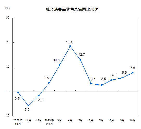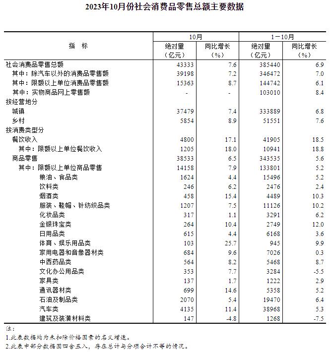 10月份,社會消費品零售總額43333億元,同比增長7.6%。其中,除汽車以外的消費品零售額39198億元,增長7.2%。