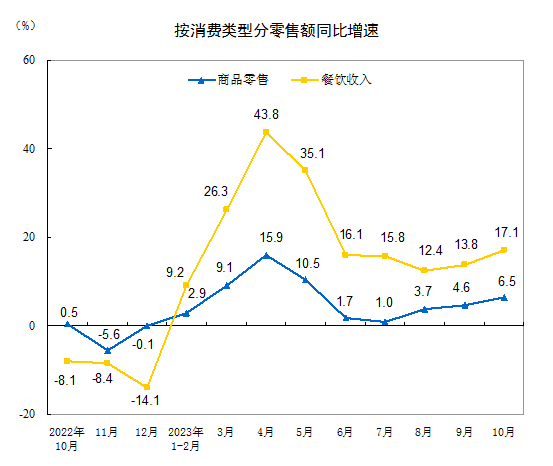 按消費類型分,10月份,商品零售38533億元,同比增長6.5%;餐飲收入4800億元,增長17.1%。1—10月份,商品零售343535億元,同比增長5.6%;餐飲收入41905億元,增長18.5%。