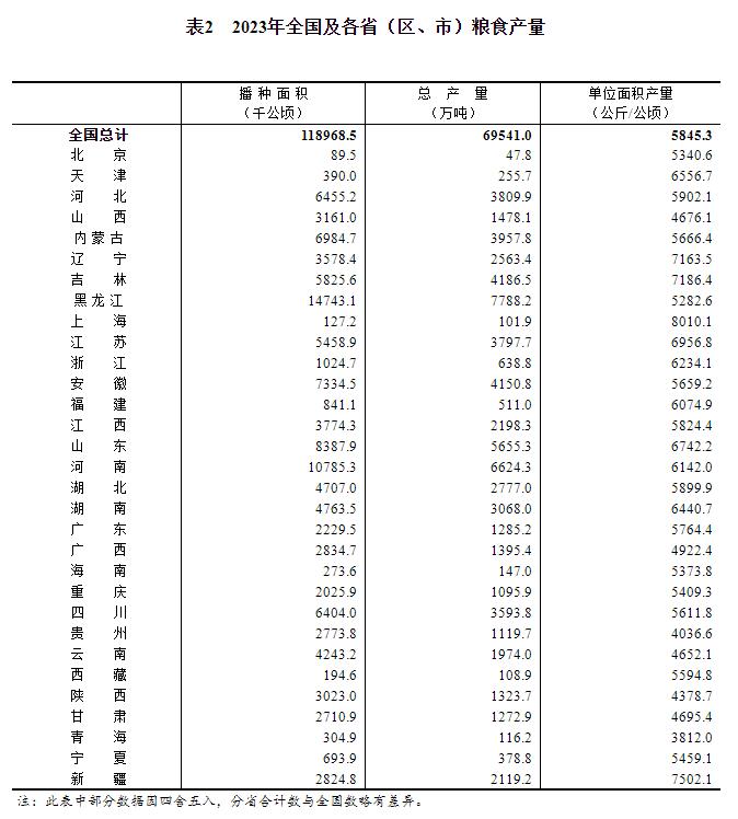 根據對全國31個?。▍^(qū)、市)的調查,2023年全國糧食播種面積、單位面積產量和總產量分別如下: