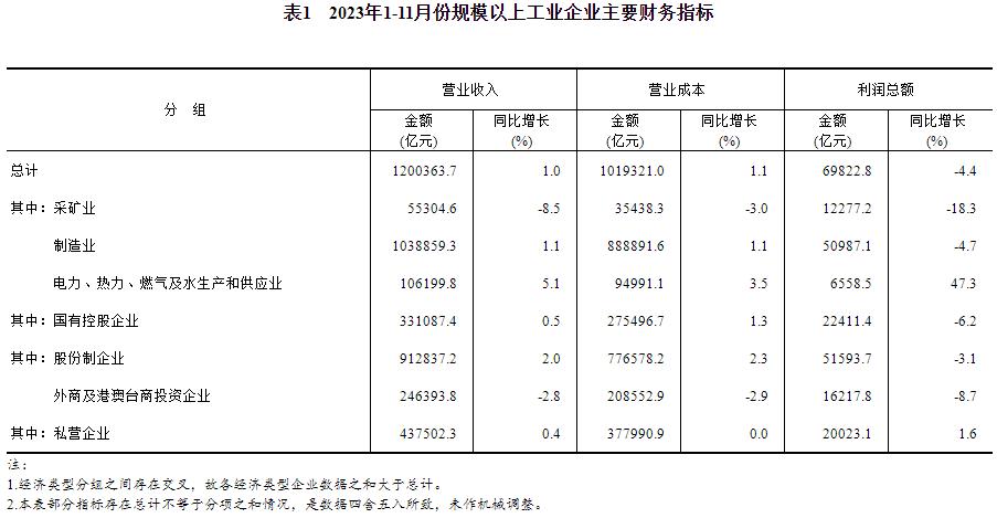 1—11月份,全國規(guī)模以上工業(yè)企業(yè)實現(xiàn)利潤總額69822.8億元,同比下降4.4%,降幅比1—10月份收窄3.4個百分點(按可比口徑計算,詳見附注二)。