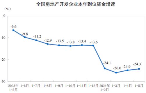 1—5月份,房地產(chǎn)開(kāi)發(fā)企業(yè)到位資金42571億元,同比下降24.3%。其中,國(guó)內(nèi)貸款6810億元,下降6.2%;利用外資11億元,下降20.3%;自籌資金14816億元,下降9.8%;定金及預(yù)收款12584億元,下降36.7%;個(gè)人按揭貸款6191億元,下降40.2%。