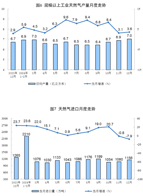 天然氣生產(chǎn)穩(wěn)步增長。12月份,規(guī)上工業(yè)天然氣產(chǎn)量218億立方米,同比增長3.6%,增速比11月份加快0.5個(gè)百分點(diǎn);日均產(chǎn)量7.0億立方米。進(jìn)口天然氣1156萬噸,同比下降7.9%。