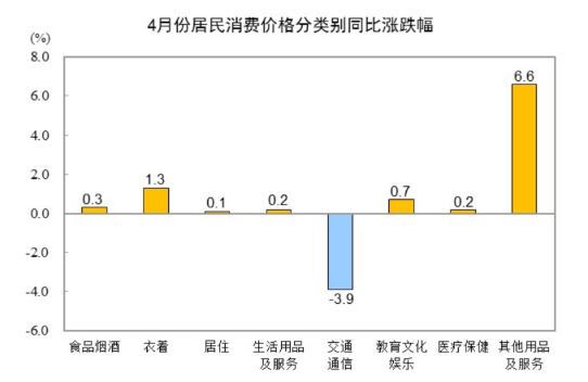 其他七大類價(jià)格同比六漲一降。其中,其他用品及服務(wù)、衣著、教育文化娛樂價(jià)格分別上漲6.6%、1.3%和0.7%,生活用品及服務(wù)、醫(yī)療保健、居住價(jià)格分別上漲0.2%、0.2%和0.1%;交通通信價(jià)格下降3.9%。