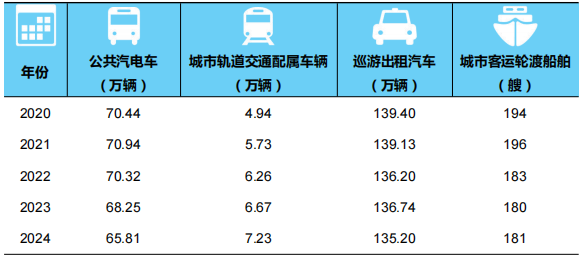 表5 2020-2024年年末全國(guó)城市客運(yùn)裝備擁有量