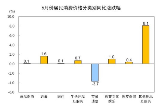 其他七大類價(jià)格同比六漲一降。其中,其他用品及服務(wù)、衣著、教育文化娛樂價(jià)格分別上漲8.1%、1.6%和1.0%,生活用品及服務(wù)、醫(yī)療保健、居住價(jià)格分別上漲0.7%、0.4%和0.1%;交通通信價(jià)格下降3.7%。