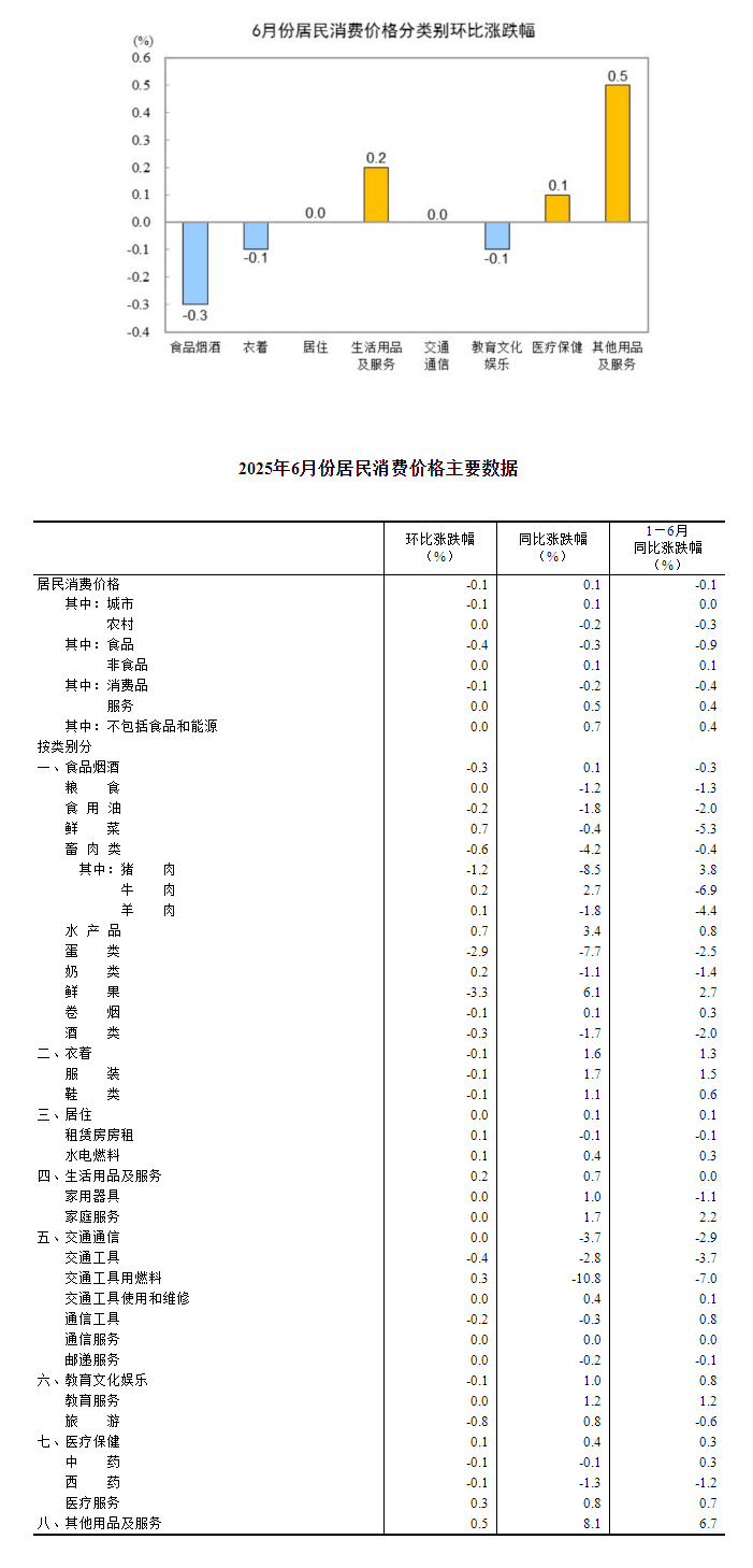 2025年6月份,全國(guó)居民消費(fèi)價(jià)格同比上漲0.1%。其中,城市上漲0.1%,農(nóng)村下降0.2%;食品價(jià)格下降0.3%,非食品價(jià)格上漲0.1%;消費(fèi)品價(jià)格下降0.2%,服務(wù)價(jià)格上漲0.5%。上半年,全國(guó)居民消費(fèi)價(jià)格比上年同期下降0.1%。