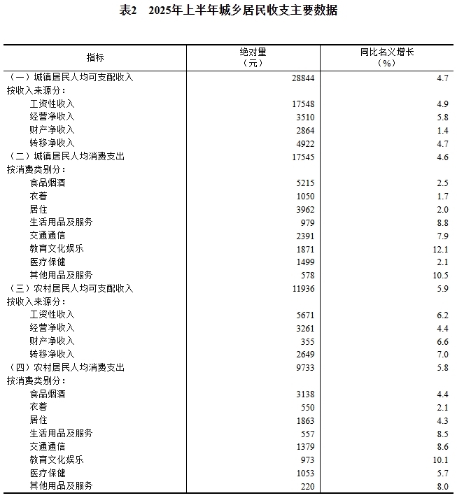 上半年,全國居民人均消費(fèi)支出14309元,比上年同期名義增長5.2%,扣除價格因素影響,實(shí)際增長5.3%。分城鄉(xiāng)看,城鎮(zhèn)居民人均消費(fèi)支出17545元,增長4.6%,扣除價格因素,實(shí)際增長4.6%;農(nóng)村居民人均消費(fèi)支出9733元,增長5.8%,扣除價格因素,實(shí)際增長6.1%。