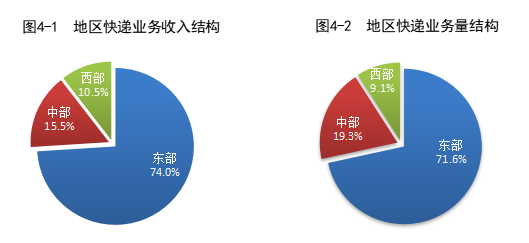 上半年,東、中、西部地區(qū)快遞業(yè)務(wù)收入比重分別為74.0%、15.5%和10.5%,快遞業(yè)務(wù)量比重分別為71.6%、19.3%和9.1%。與去年同期相比,東部地區(qū)快遞業(yè)務(wù)收入比重下降0.8個(gè)百分點(diǎn),快遞業(yè)務(wù)量比重下降1.4個(gè)百分點(diǎn);中部地區(qū)快遞業(yè)務(wù)收入比重上升0.5個(gè)百分點(diǎn),快遞業(yè)務(wù)量比重上升0.8個(gè)百分點(diǎn);西部地區(qū)快遞業(yè)務(wù)收入比重上升0.3個(gè)百分點(diǎn),快遞業(yè)務(wù)量比重上升0.6個(gè)百分點(diǎn)。