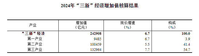 經(jīng)核算,2024年我國(guó)“三新”經(jīng)濟(jì)增加值為242908億元,比上年增長(zhǎng)6.7%(按現(xiàn)價(jià)計(jì)算),比同期國(guó)內(nèi)生產(chǎn)總值(GDP)現(xiàn)價(jià)增速高2.5個(gè)百分點(diǎn);占GDP的比重為18.01%,比上年提高0.43個(gè)百分點(diǎn)[1]。