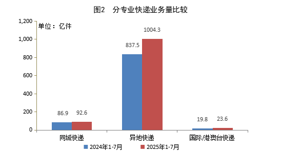 1—7月,同城快遞業(yè)務(wù)量累計(jì)完成92.6億件,同比增長(zhǎng)6.5%;異地快遞業(yè)務(wù)量累計(jì)完成1004.3億件,同比增長(zhǎng)19.9%;國(guó)際/港澳臺(tái)快遞業(yè)務(wù)量累計(jì)完成23.6億件,同比增長(zhǎng)19.2%。