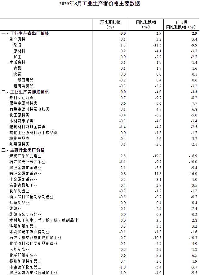 2025年8月份,全國工業(yè)生產(chǎn)者出廠價格同比下降2.9%,降幅比上月收窄0.7個百分點,環(huán)比由下降0.2%轉(zhuǎn)為持平。工業(yè)生產(chǎn)者購進(jìn)價格同比下降4.0%,環(huán)比持平。1—8月平均,工業(yè)生產(chǎn)者出廠價格比上年同期下降2.9%,工業(yè)生產(chǎn)者購進(jìn)價格下降3.3%。