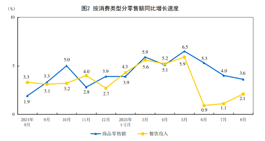 按消費(fèi)類型分,8月份,商品零售額35172億元,同比增長3.6%;餐飲收入4496億元,增長2.1%。1—8月份,商品零售額287426億元,增長4.8%;餐飲收入36480億元,增長3.6%。