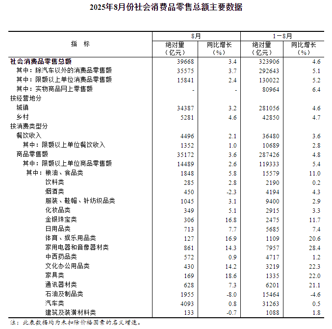 8月份,社會消費(fèi)品零售總額39668億元,同比增長3.4%。其中,除汽車以外的消費(fèi)品零售額35575億元,增長3.7%。1—8月份,社會消費(fèi)品零售總額323906億元,增長4.6%。其中,除汽車以外的消費(fèi)品零售額292643億元,增長5.1%。