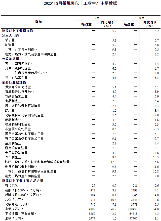 8月份,規(guī)模以上工業(yè)增加值同比實(shí)際增長(zhǎng)5.2%(增加值增速均為扣除價(jià)格因素的實(shí)際增長(zhǎng)率)。從環(huán)比看,8月份,規(guī)模以上工業(yè)增加值比上月增長(zhǎng)0.37%。1—8月份,規(guī)模以上工業(yè)增加值同比增長(zhǎng)6.2%。