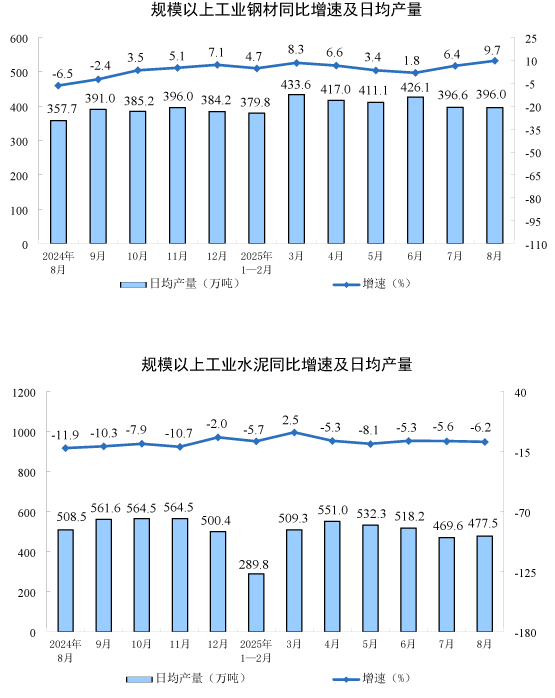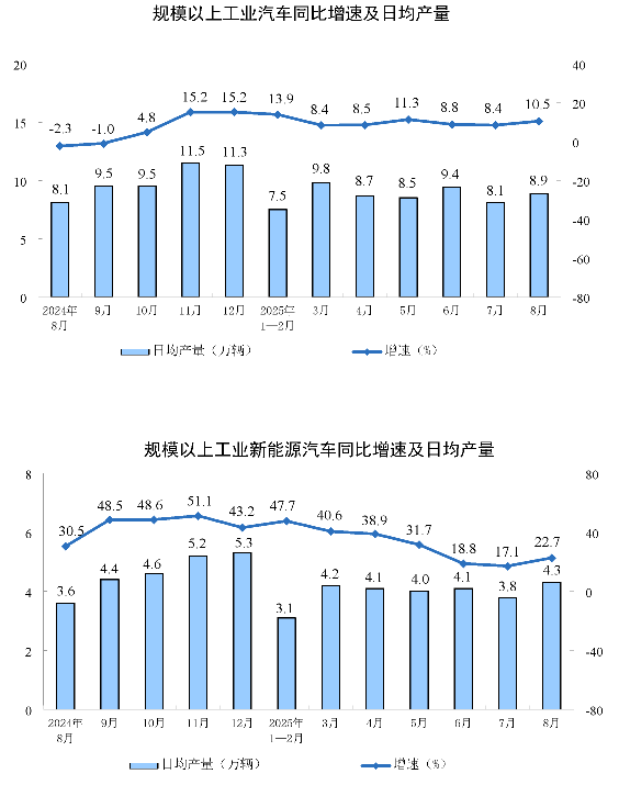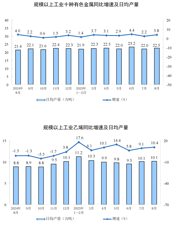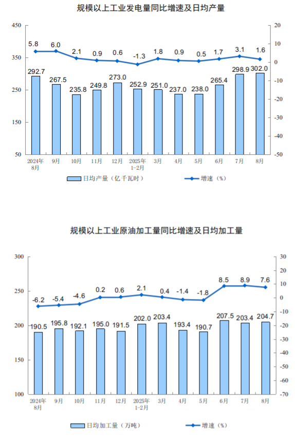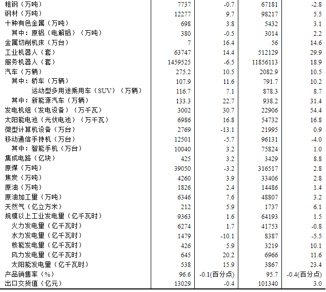 分產(chǎn)品看,8月份,規(guī)模以上工業(yè)623種產(chǎn)品中有319種產(chǎn)品產(chǎn)量同比增長(zhǎng)。其中,鋼材12277萬(wàn)噸,同比增長(zhǎng)9.7%;水泥14802萬(wàn)噸,下降6.2%;十種有色金屬698萬(wàn)噸,增長(zhǎng)3.8%;乙烯314萬(wàn)噸,增長(zhǎng)10.4%;汽車(chē)275.2萬(wàn)輛,增長(zhǎng)10.5%,其中新能源汽車(chē)133.3萬(wàn)輛,增長(zhǎng)22.7%;發(fā)電量9363億千瓦時(shí),增長(zhǎng)1.6%;原油加工量6346萬(wàn)噸,增長(zhǎng)7.6%。