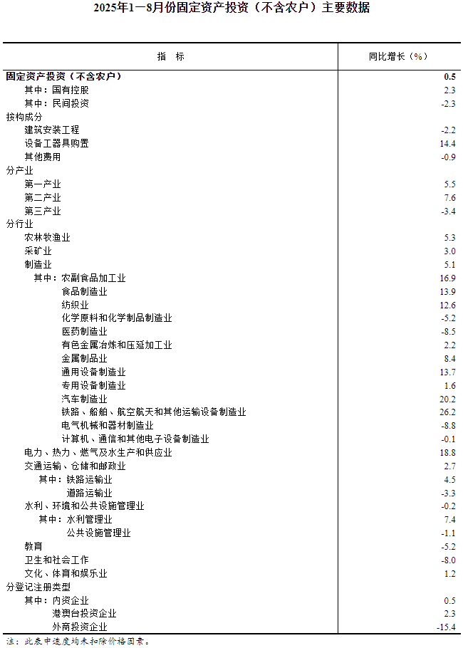 2025年1—8月份,全國固定資產(chǎn)投資(不含農(nóng)戶)326111億元,同比增長0.5%(按可比口徑計(jì)算,詳見附注7)。其中,民間固定資產(chǎn)投資同比下降2.3%。從環(huán)比看,8月份固定資產(chǎn)投資(不含農(nóng)戶)下降0.20%。