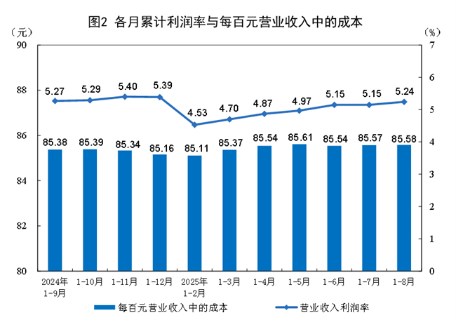 1—8月份,規(guī)模以上工業(yè)企業(yè)實現(xiàn)營業(yè)收入89.62萬億元,同比增長2.3%;發(fā)生營業(yè)成本76.70萬億元,增長2.5%;營業(yè)收入利潤率為5.24%,同比下降0.06個百分點。