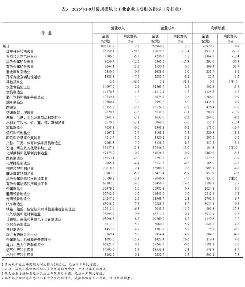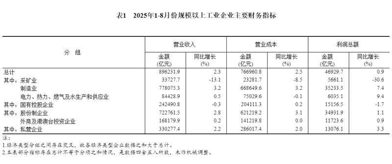 1—8月份,全國規(guī)模以上工業(yè)企業(yè)實現(xiàn)利潤總額46929.7億元,同比增長0.9%(按可比口徑計算,詳見附注二)。