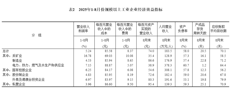 8月末,規(guī)模以上工業(yè)企業(yè)每百元資產(chǎn)實現(xiàn)的營業(yè)收入為74.0元,同比減少2.0元;人均營業(yè)收入為183.5萬元,同比增加5.7萬元;產(chǎn)成品存貨周轉天數(shù)為20.5天,同比增加0.1天;應收賬款平均回收期為70.1天,同比增加3.7天。