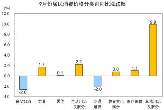 9月份,全國居民消費價格環(huán)比上漲0.1%。其中,城市持平,農(nóng)村上漲0.2%;食品價格上漲0.7%,非食品價格下降0.1%;消費品價格上漲0.3%,服務價格下降0.3%。