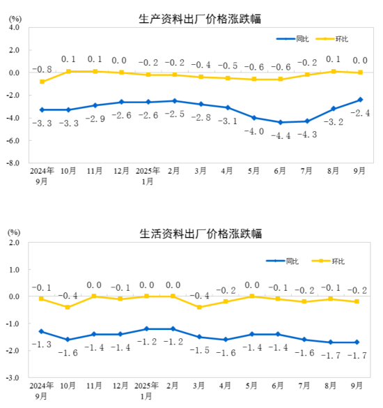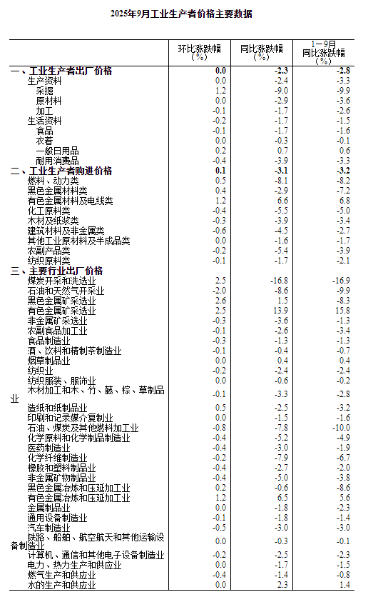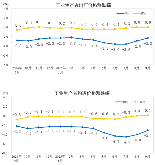 2025年9月份,全國工業(yè)生產者出廠價格同比下降2.3%,降幅比上月收窄0.6個百分點,環(huán)比繼續(xù)持平。工業(yè)生產者購進價格同比下降3.1%,降幅比上月收窄0.9個百分點,環(huán)比上漲0.1%。1—9月平均,工業(yè)生產者出廠價格比上年同期下降2.8%,工業(yè)生產者購進價格下降3.2%。