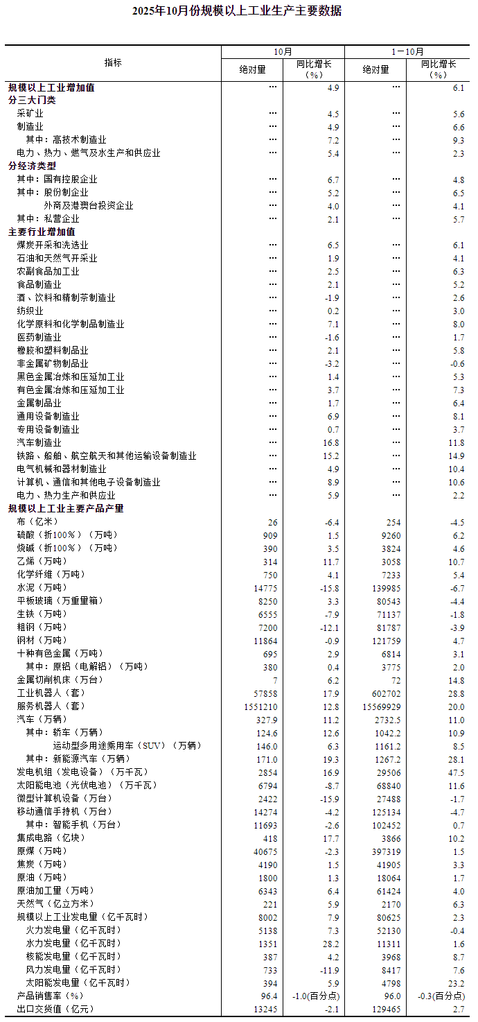分三大門(mén)類(lèi)看,10月份,采礦業(yè)增加值同比增長(zhǎng)4.5%,制造業(yè)增長(zhǎng)4.9%,電力、熱力、燃?xì)饧八a(chǎn)和供應(yīng)業(yè)增長(zhǎng)5.4%。