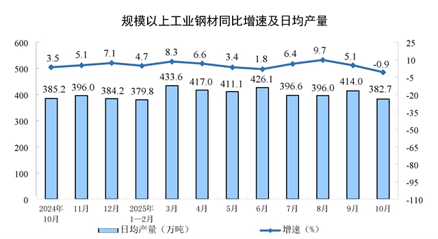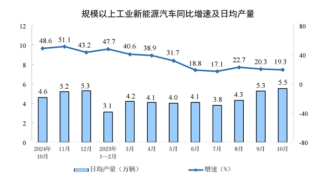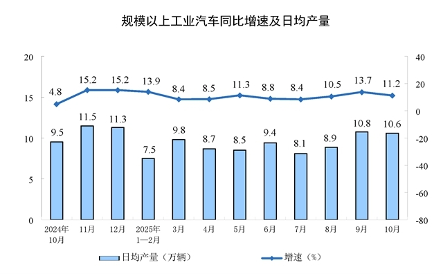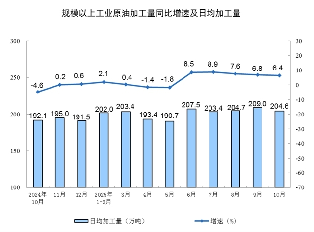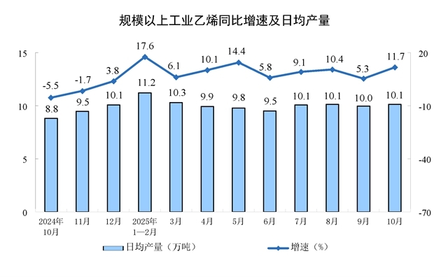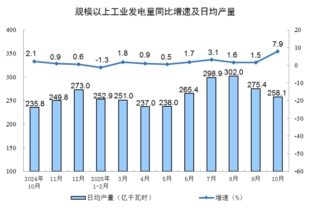 分產(chǎn)品看,10月份,規(guī)模以上工業(yè)623種產(chǎn)品中有313種產(chǎn)品產(chǎn)量同比增長(zhǎng)。其中,鋼材11864萬(wàn)噸,同比下降0.9%;水泥14775萬(wàn)噸,下降15.8%;十種有色金屬695萬(wàn)噸,增長(zhǎng)2.9%;乙烯314萬(wàn)噸,增長(zhǎng)11.7%;汽車(chē)327.9萬(wàn)輛,增長(zhǎng)11.2%,其中新能源汽車(chē)171.0萬(wàn)輛,增長(zhǎng)19.3%;發(fā)電量8002億千瓦時(shí),增長(zhǎng)7.9%;原油加工量6343萬(wàn)噸,增長(zhǎng)6.4%。