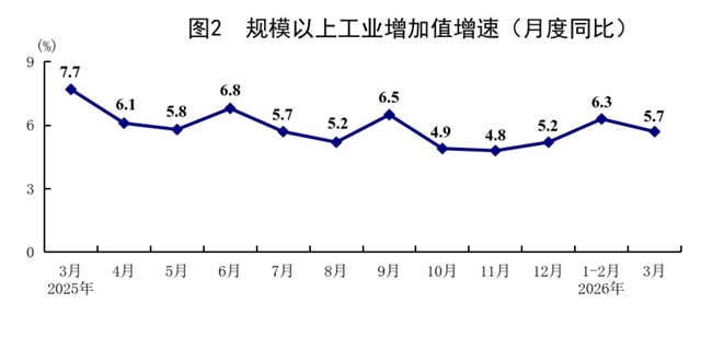 一季度,全國(guó)規(guī)模以上工業(yè)增加值同比增長(zhǎng)6.1%,比上年四季度加快1.1個(gè)百分點(diǎn)。分三大門(mén)類看,采礦業(yè)增加值同比增長(zhǎng)6.0%,制造業(yè)增長(zhǎng)6.4%,電力、熱力、燃?xì)饧八a(chǎn)和供應(yīng)業(yè)增長(zhǎng)4.3%。裝備制造業(yè)增加值同比增長(zhǎng)8.9%,高技術(shù)制造業(yè)增加值增長(zhǎng)12.5%,分別快于全部規(guī)模以上工業(yè)增加值2.8和6.4個(gè)百分點(diǎn)。分經(jīng)濟(jì)類型看,國(guó)有控股企業(yè)增加值同比增長(zhǎng)4.8%;股份制企業(yè)增長(zhǎng)6.6%,外商及港澳臺(tái)投資企業(yè)增長(zhǎng)3.9%;私營(yíng)企業(yè)增長(zhǎng)6.1%。分產(chǎn)品看,3D打印設(shè)備、鋰離子電池、工業(yè)機(jī)器人產(chǎn)品產(chǎn)量同比分別增長(zhǎng)54.0%、40.8%、33.2%。3月份,規(guī)模以上工業(yè)增加值同比增長(zhǎng)5.7%,環(huán)比增長(zhǎng)0.28%。3月份,制造業(yè)采購(gòu)經(jīng)理指數(shù)為50.4%,比上月上升1.4個(gè)百分點(diǎn);企業(yè)生產(chǎn)經(jīng)營(yíng)活動(dòng)預(yù)期指數(shù)為53.4%。1—2月份,全國(guó)規(guī)模以上工業(yè)企業(yè)實(shí)現(xiàn)利潤(rùn)總額10246億元,同比增長(zhǎng)15.2%。