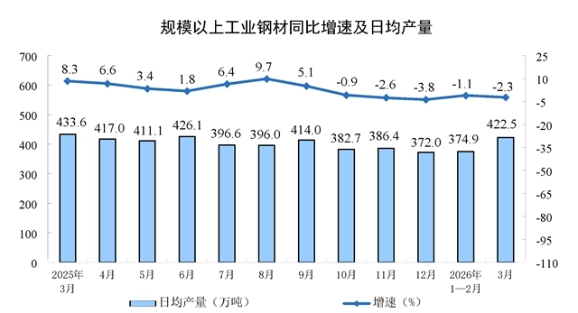 分產(chǎn)品看,3月份,規(guī)模以上工業(yè)626種產(chǎn)品中有329種產(chǎn)品產(chǎn)量同比增長。其中,鋼材13098萬噸,同比下降2.3%;水泥12310萬噸,下降21.0%;十種有色金屬707萬噸,增長2.2%;乙烯364萬噸,增長6.8%;汽車306.7萬輛,下降0.1%,其中新能源汽車133.6萬輛,增長1.2%;發(fā)電量8025億千瓦時,增長1.4%;原油加工量6167萬噸,下降2.2%。