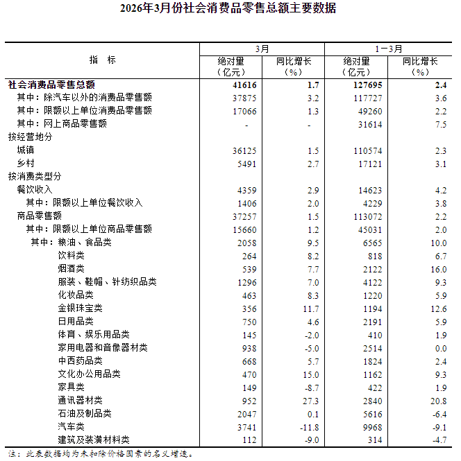 3月份,社會消費品零售總額41616億元,同比增長1.7%。其中,除汽車以外的消費品零售額37875億元,增長3.2%。1—3月份,社會消費品零售總額127695億元,同比增長2.4%。其中,除汽車以外的消費品零售額117727億元,增長3.6%。