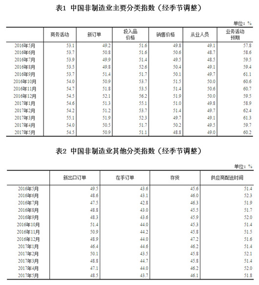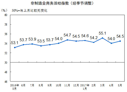 2017年5月份,中國非制造業(yè)商務活動指數(shù)為54.5%,比上月上升0.5個百分點,位于擴張區(qū)間,非制造業(yè)繼續(xù)保持平穩(wěn)較快的發(fā)展勢頭,增速有所加快。