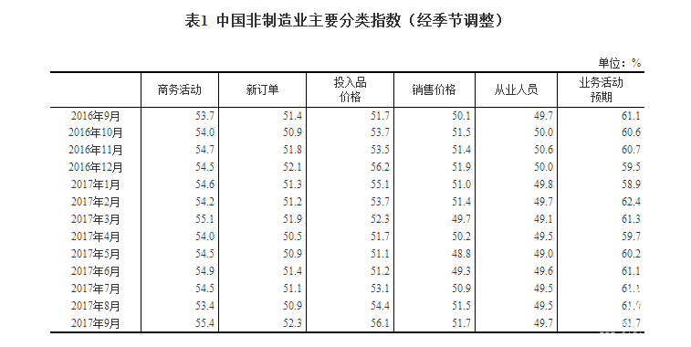 中國(guó)產(chǎn)業(yè)經(jīng)濟(jì)信息網(wǎng)訊 2017年9月份,中國(guó)非制造業(yè)商務(wù)活動(dòng)指數(shù)為55.4%,比上月上升2.0個(gè)百分點(diǎn),非制造業(yè)繼續(xù)保持增長(zhǎng),增速有所加快。