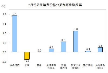 2月份,全國(guó)居民消費(fèi)價(jià)格環(huán)比上漲1.2%。其中,城市上漲1.3%,農(nóng)村上漲1.1%;食品價(jià)格上漲4.4%,非食品價(jià)格上漲0.5%;消費(fèi)品價(jià)格上漲1.4%,服務(wù)價(jià)格上漲1.0%。