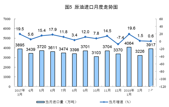 原油進(jìn)口增速回落。一季度,進(jìn)口原油11207萬噸,同比增長(zhǎng)7.0%。3月份,進(jìn)口原油3917萬噸,同比增長(zhǎng)0.6%,增速比1-2月份回落0.9個(gè)百分點(diǎn)。