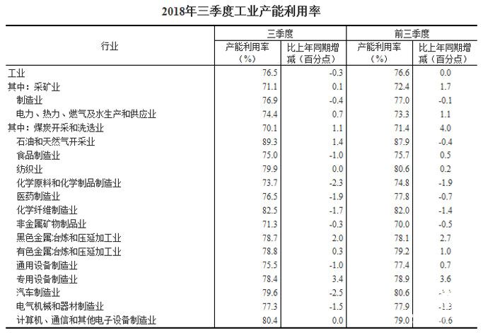 2018年三季度,全國工業(yè)產(chǎn)能利用率為76.5%,比上年同期下降0.3個百分點。前三季度,全國工業(yè)產(chǎn)能利用率為76.6%,與上年同期持平。