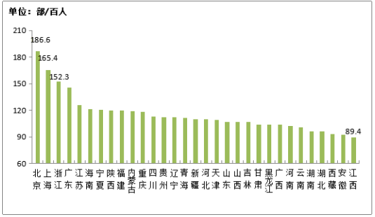 報(bào)告稱,全國已有26個(gè)省市的移動(dòng)電話普及率超過100部/百人。固定電話用戶總數(shù)1.91億戶,比上年末減少105萬戶,普及率下降至13.6部/百人。