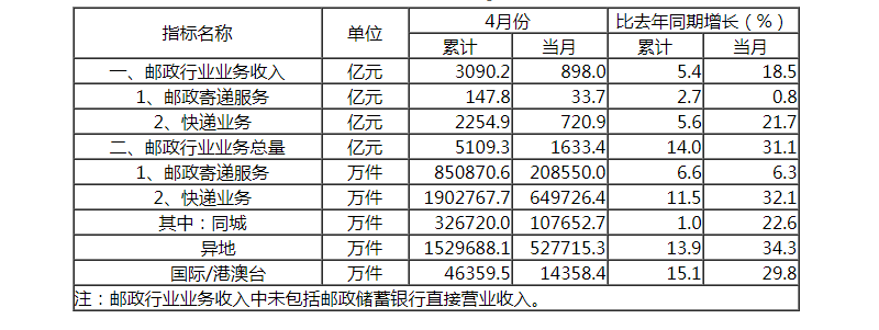 4月份,全行業(yè)業(yè)務(wù)收入完成898億元,同比增長(zhǎng)18.5%;業(yè)務(wù)總量完成1633.4億元,同比增長(zhǎng)31.1%。